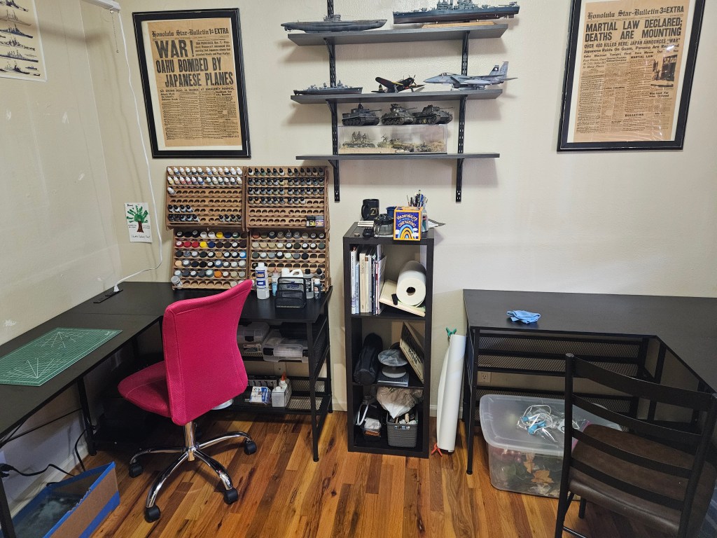 I’ve decided to upgrade my workstation. I committed to my hobby room, and refurnished it with a couple of desks and some upgraded paint holders and tool station. The pegboard has done me well over the years, but it was time for a refit.