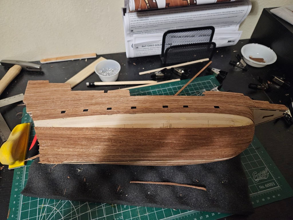 Keeping the lessons from the 1st layer of planking in mind, I approached the 2nd layer with a different mindset. With the shape of the bow, I had a feeling I was going to have a hard time if I attempted to plank “correctly” with the thin walnut strips. I instead decided on an approach that I learned from a YouTube video, where the author uses long strips to figure out the true shape of the hull. Letting the strips run naturally, the “bulbous” shape of the hull presented itself, and I ran the strips symmetrically along it.