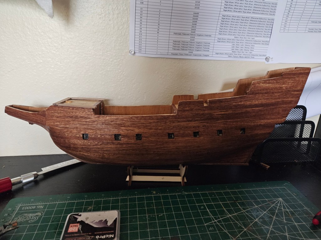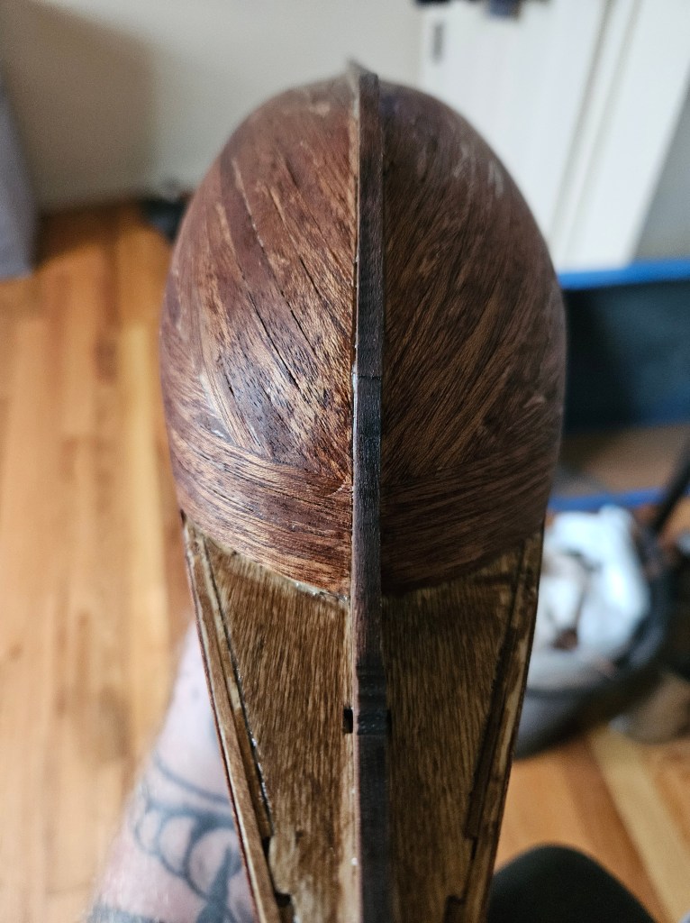 After some sanding and fiddling with the groove left for the keel, I managed to attach it and stain everything. I decided to finish it with Dark Walnut Danish Oil, which really made the wood pop.