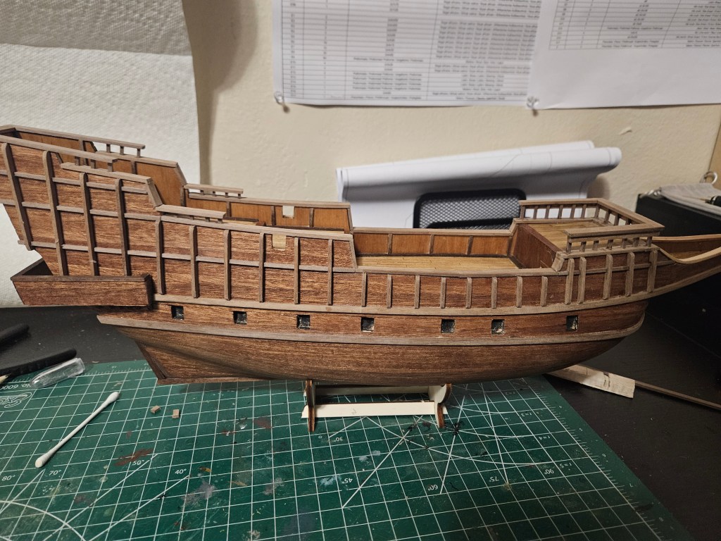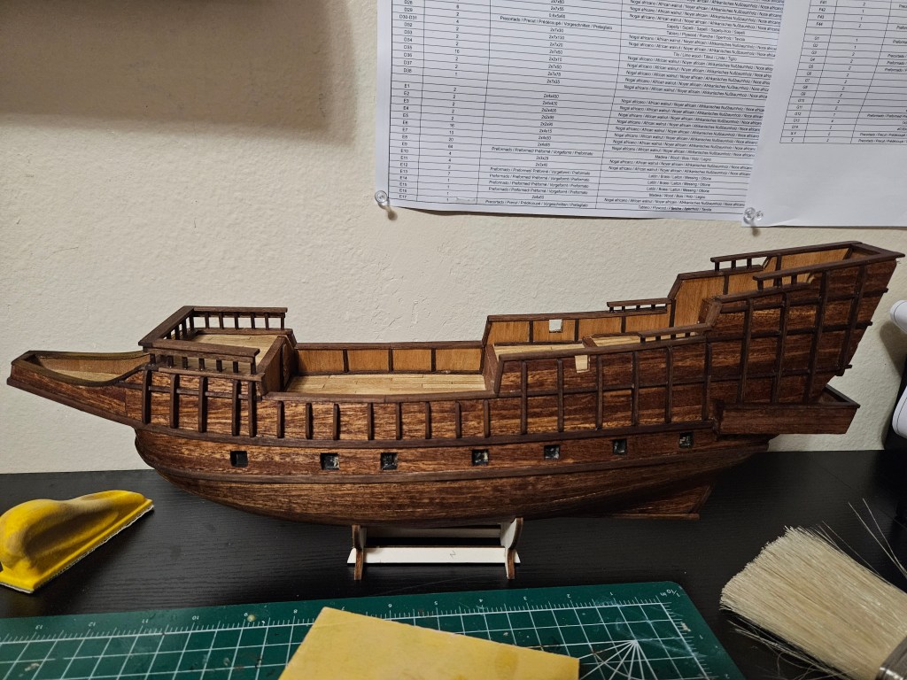 Finished up the vertical strakes across the hull, and ribs along the inside of the bulwarks. They were very tedious, but turned out very good. Gave the entire surface a good sanding with 320 grit in preparation for stain.