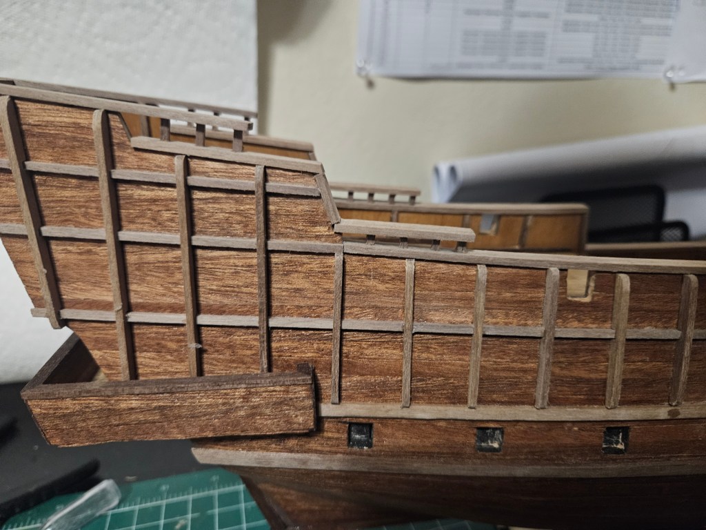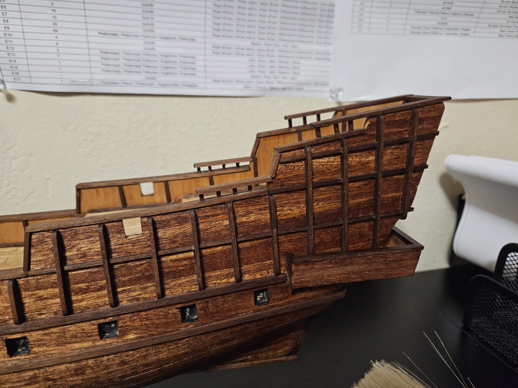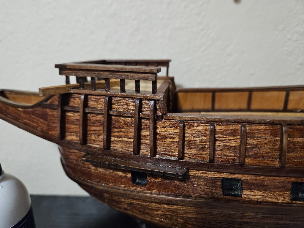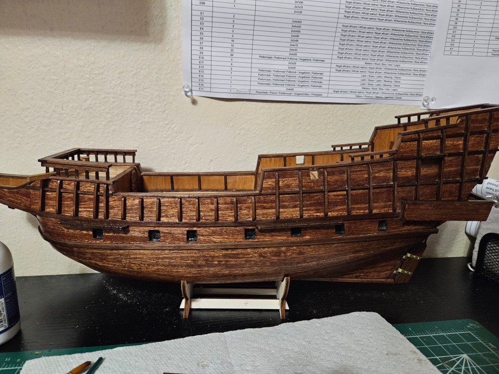 I used the Dark Walnut Danish Oil for the hull and superstructure elements. Also added the chainplates.